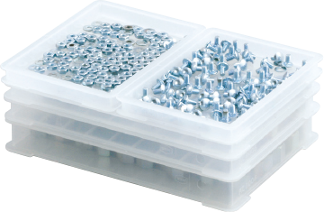 ネジやボルトなど精密小型部品の管理・保管に最適なのが、セキスイオリジナルのトレイモジュールコンテナです。中身の見える透明タイプなら保管時の内容物確認も容易。スタック(積み重ね)も可能ですので、省スペース化が図れます。