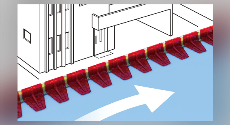 連結設置でカンタン・スピーディに洪水を堰き止め、建物に流れ込むのを防ぐ。 土嚢に代わる次世代型洪水防護製品です。