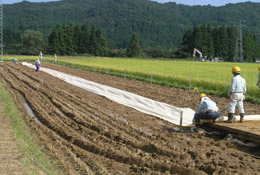 所定の位置に土木シートを敷設する。