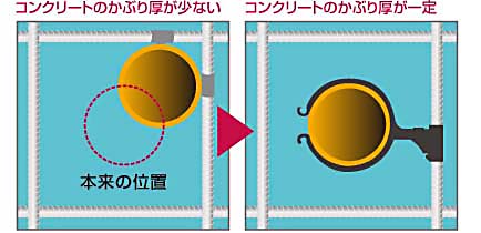 これまで、配管スリーブを型枠施工する際には、結束線で固定する方法が一般的でした。この方法だと、施工時間がかかり、本来の位置ではない場所に固定したりするケースも多くありました。